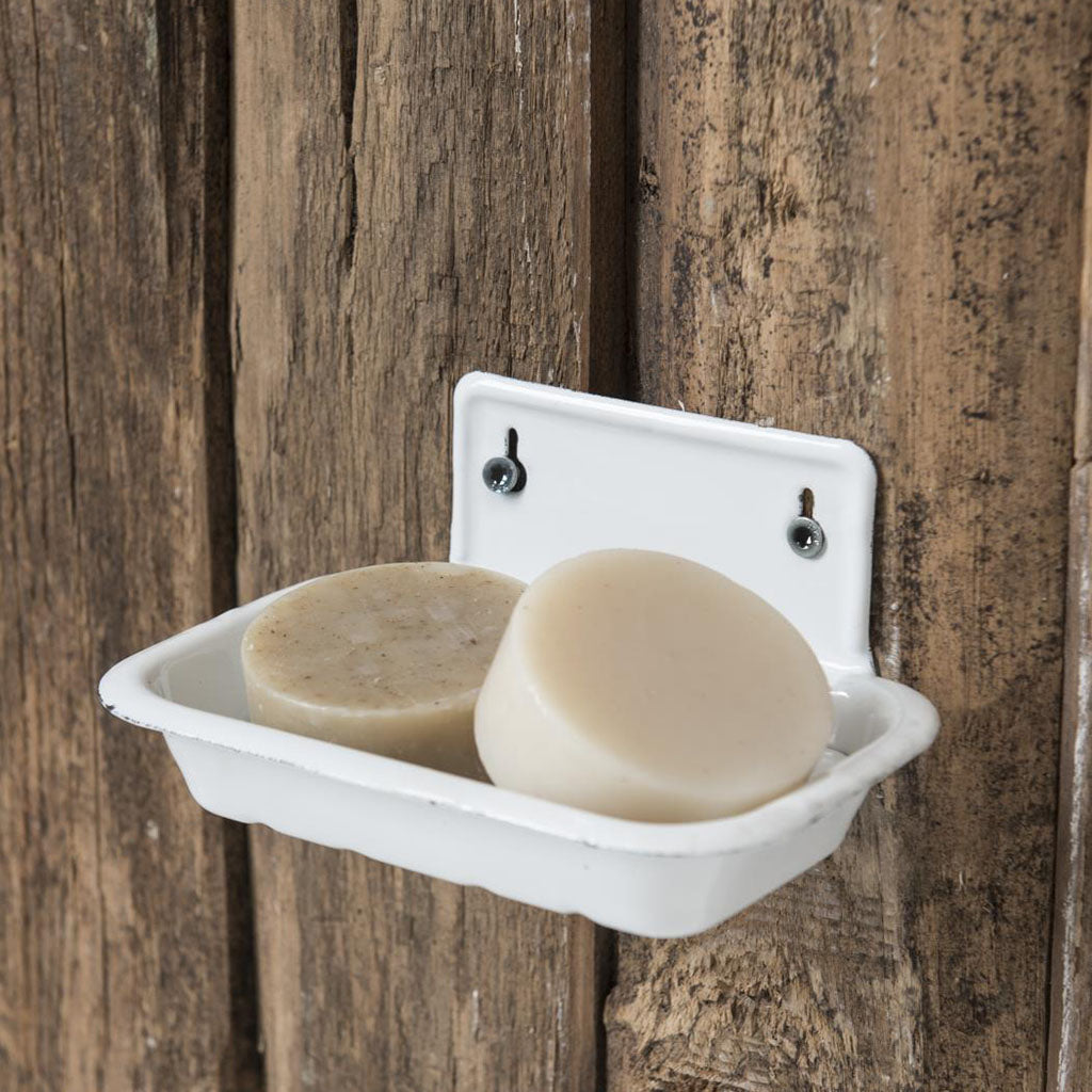 White enamel soap-dish in 2 parts. There is a tray with holes that keeps the soap from swimming in water. The soap-dish can be wall-mounted. Perfect for a country or rustic interior.